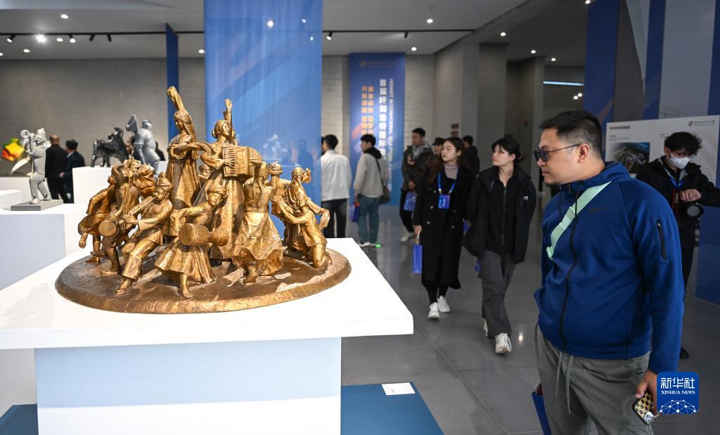 10月14日,觀眾在首屆呼和浩特國際雕塑藝術展上觀賞雕塑作品。
