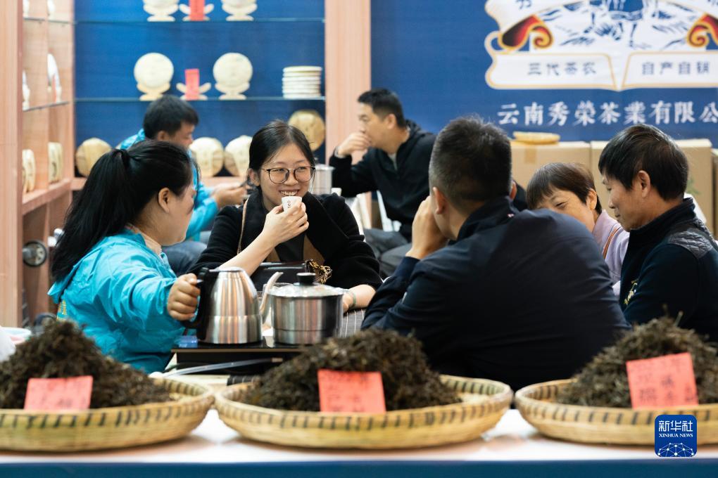 10月14日,參觀者在第十五屆中國云南普洱茶國際博覽交易會上品茶。
