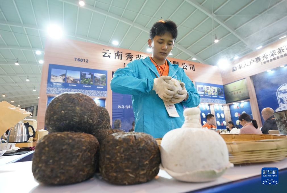 10月14日,參展商在第十五屆中國云南普洱茶國際博覽交易會上制作茶瓜。