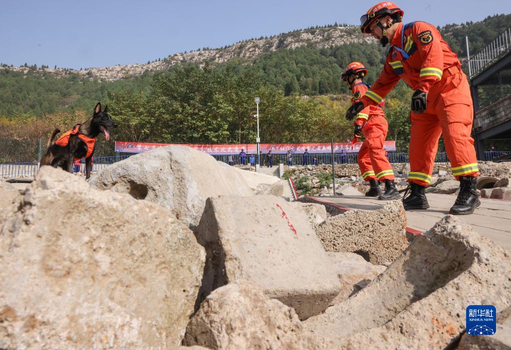 10月14日,參賽訓導員和搜救犬在進行廢墟搜救。