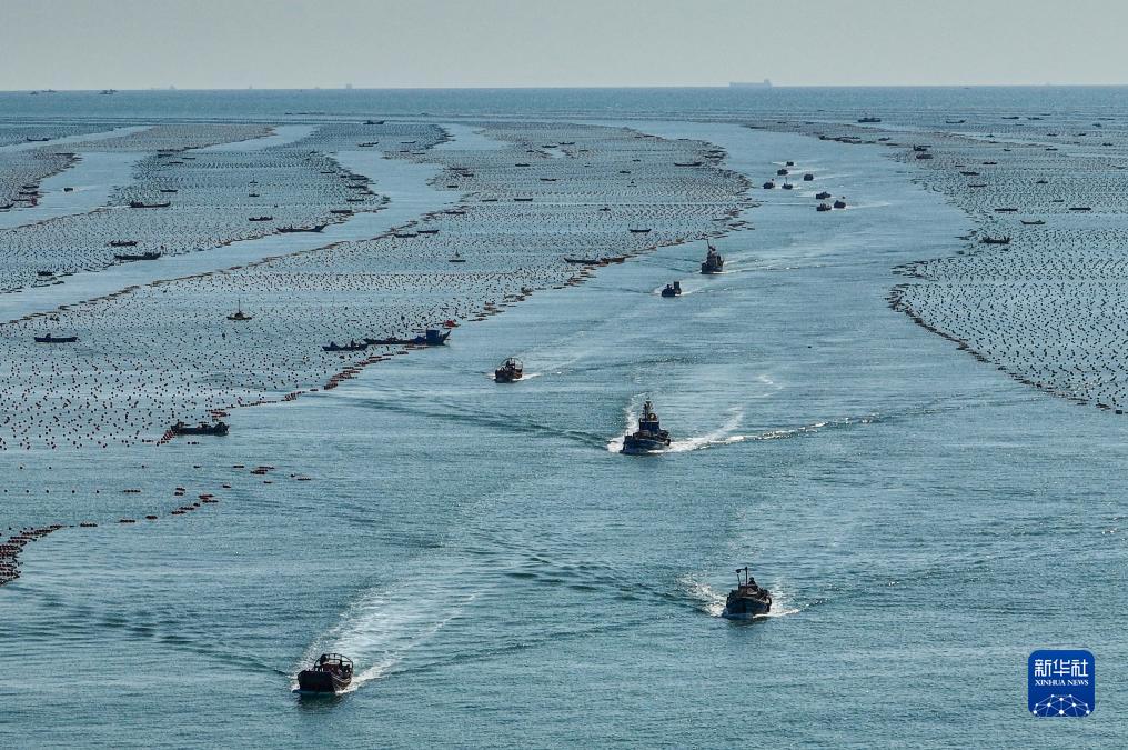 10月11日,在山東省榮成市愛(ài)倫灣海洋牧場(chǎng)生態(tài)養(yǎng)殖區(qū),漁民駕駛漁船、舢板出海作業(yè)(無(wú)人機(jī)照片)。