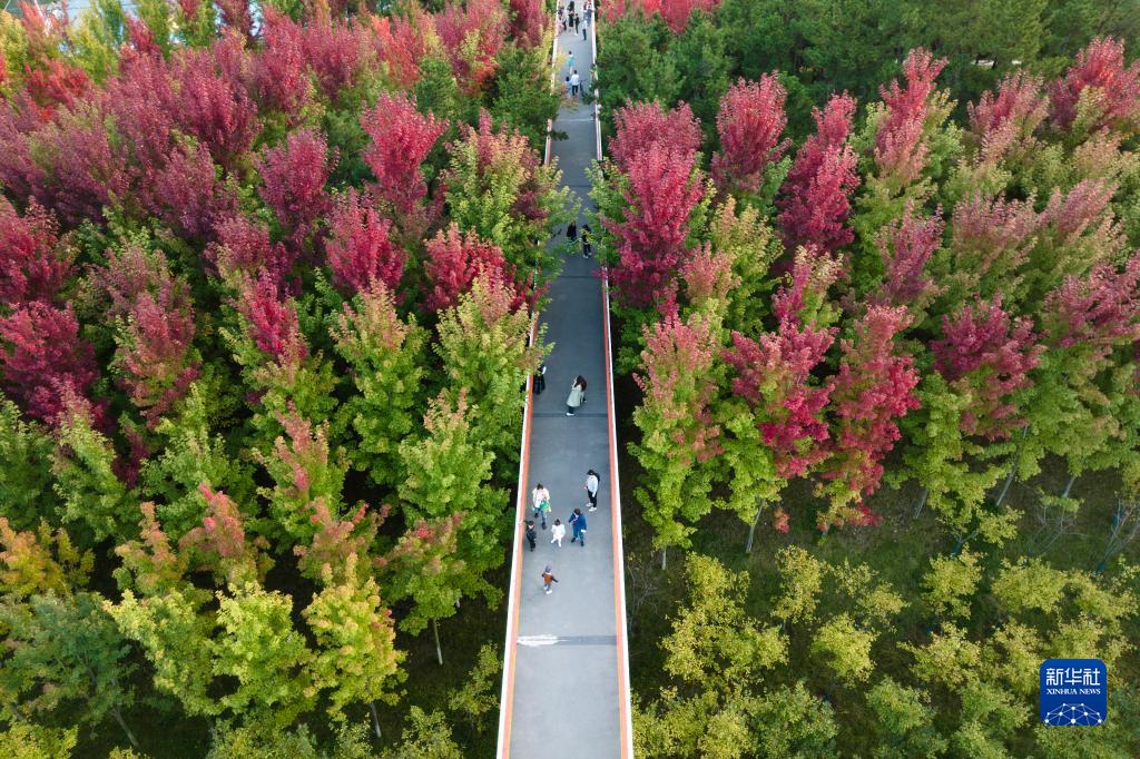 10月7日,市民在陜西西安雁南公園內(nèi)駐足觀景(無人機(jī)照片)。