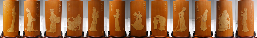 10月14日拍攝的劉旦宅畫、徐秉方刻的留青竹刻臺屏作品“金陵十二釵”(拼版照片)。