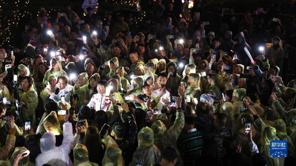 10月13日,剛剛在杭州亞運會皮劃艇項目上獲冠軍的帥常文(白衣左)與在龍舟項目上奪冠的楊海雷(白衣右)在貴陽市文昌閣路邊音樂會現(xiàn)場演唱。