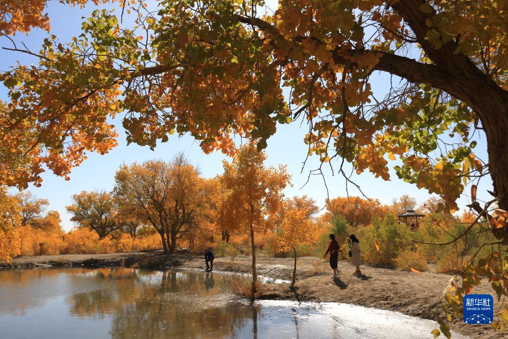 10月14日,游客在甘肅省敦煌市黃渠鎮(zhèn)胡楊林中賞景。
