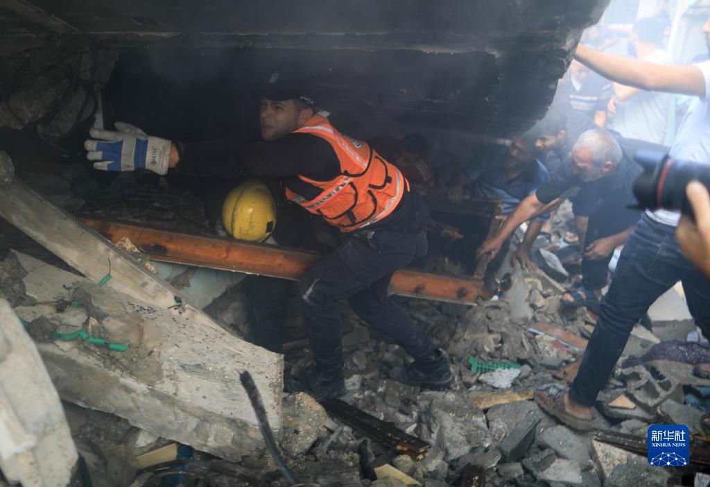 10月14日,在加沙地帶南部城市汗尤尼斯,人們在遭以色列空襲炸毀的建筑中救援。