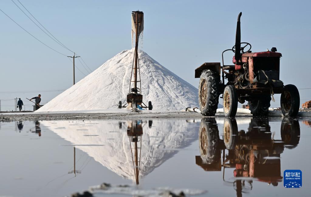 10月14日,工人在河北省灤南縣嘴東經濟開發區鹽場收獲秋鹽。