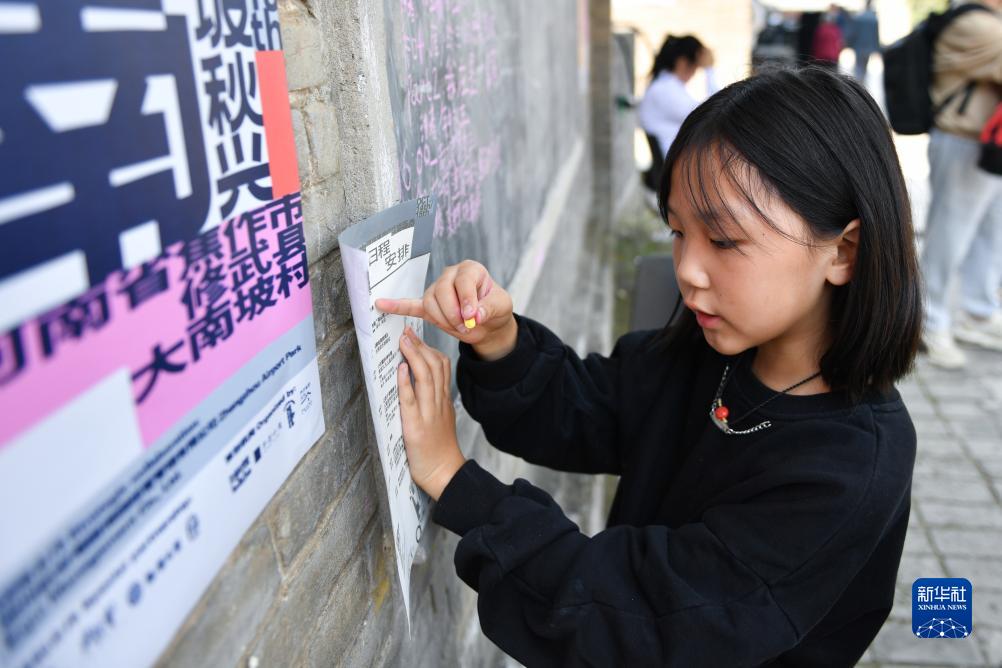 10月14日,大南坡小學學生王藝可在村內廣場寫下活動日程安排。