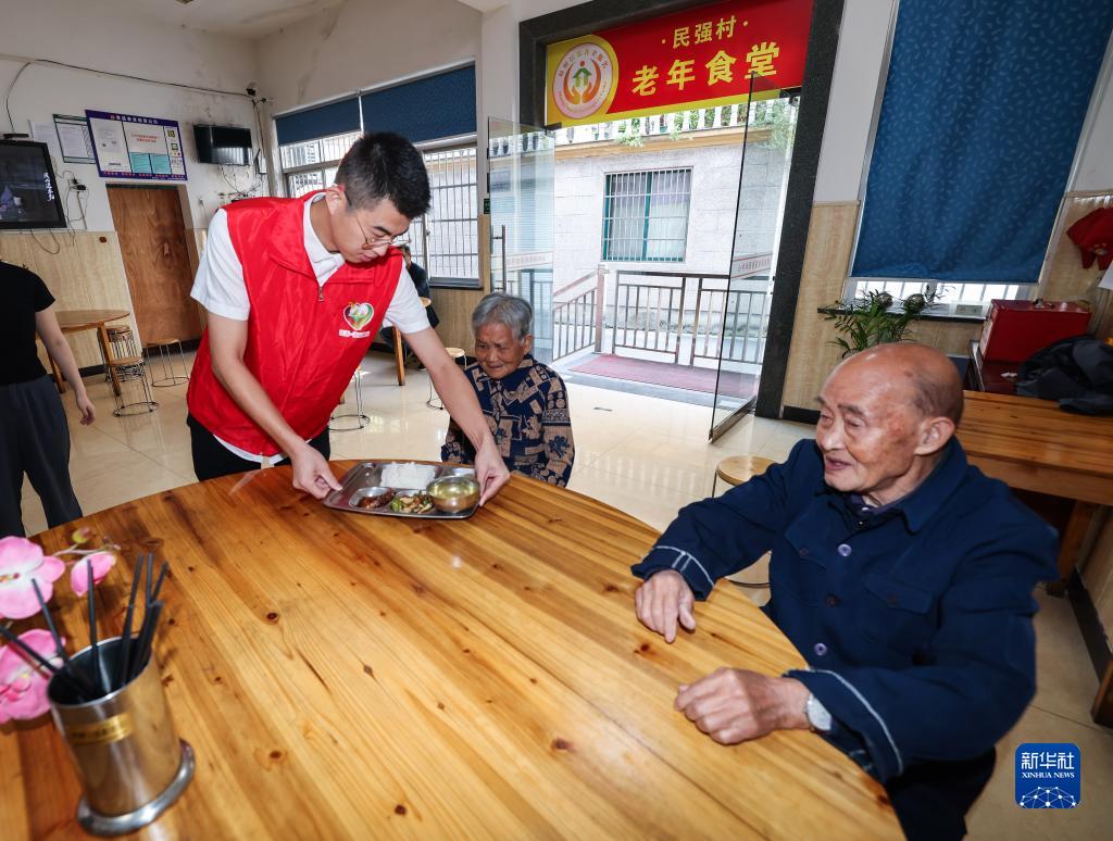 10月15日,在杭州市富陽區里山鎮民強村老年食堂,黨員志愿者給老人配餐。