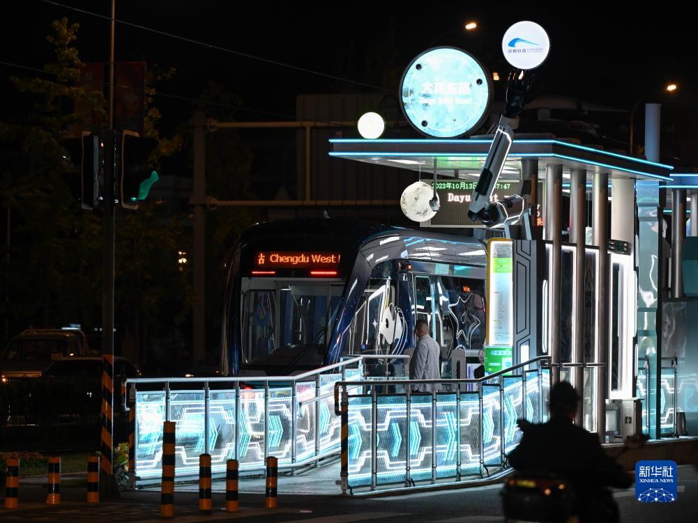 10月13日,在成都市郫都區,一輛2023成都世界科幻大會主題電車駛入車站。