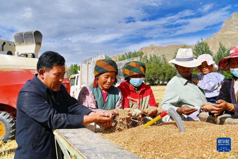 在西藏拉薩市曲水縣,人們收獲青稞(9月11日攝)。