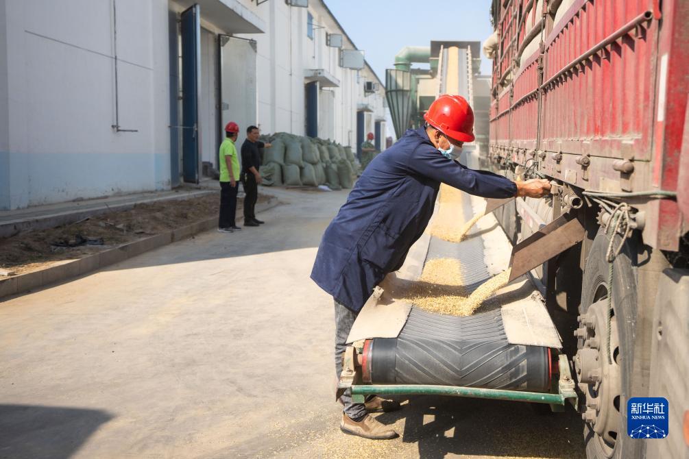 10月15日,在南縣南洲橋國家糧食儲備中心,工作人員開倉卸載運(yùn)糧車上的糧食。