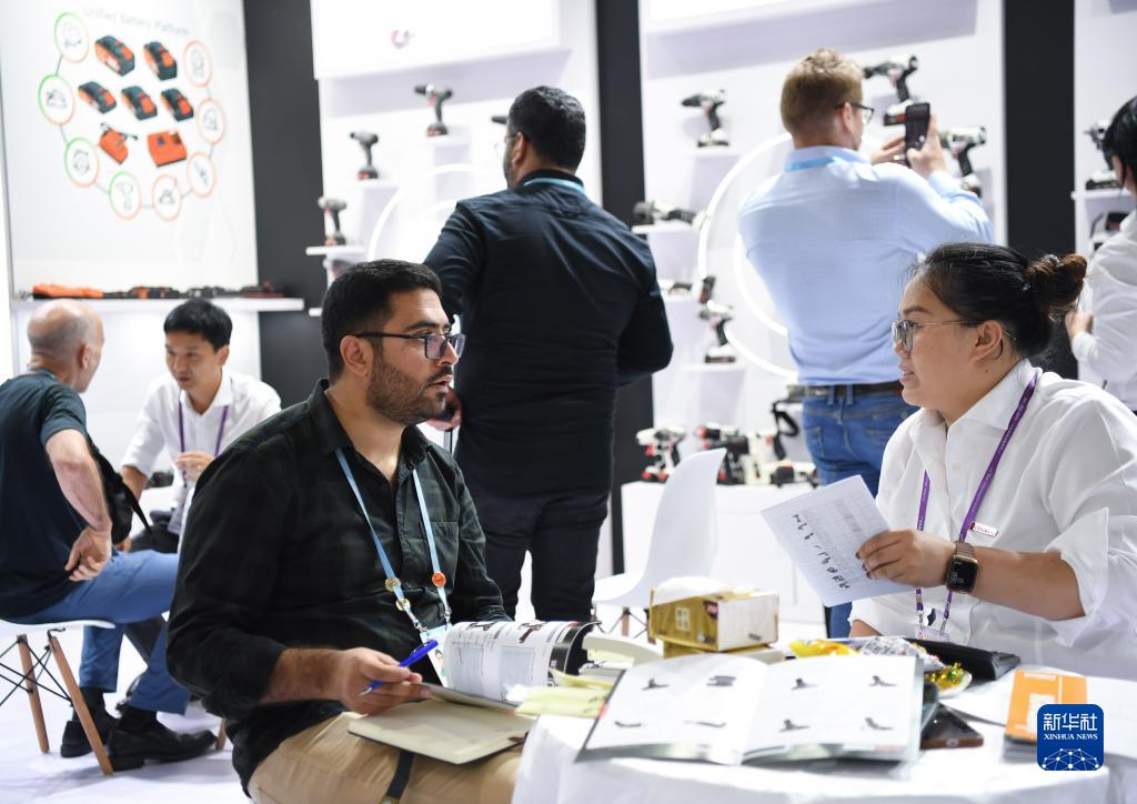 10月15日,在一家電動工具展臺,外國采購商在洽談業務。