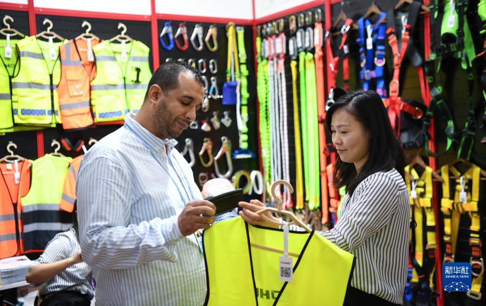 10月15日,外國采購商在了解勞保用品。