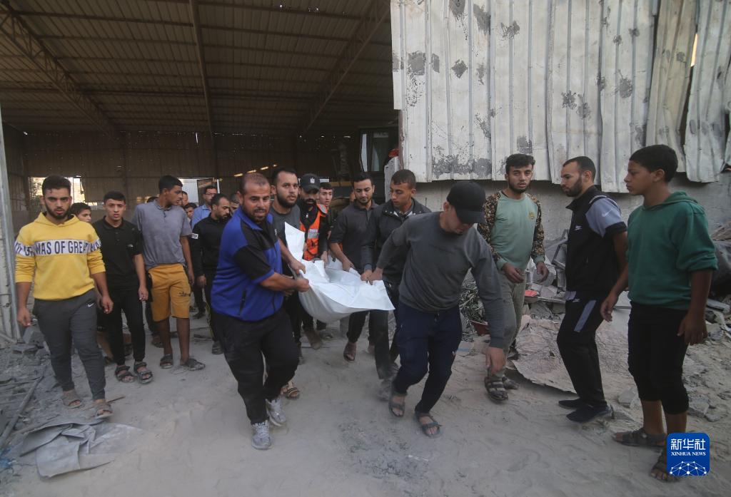 10月15日,在加沙地帶南部城市拉法,人們從遭以色列空襲后的受損建筑中抬出遇難者遺體。