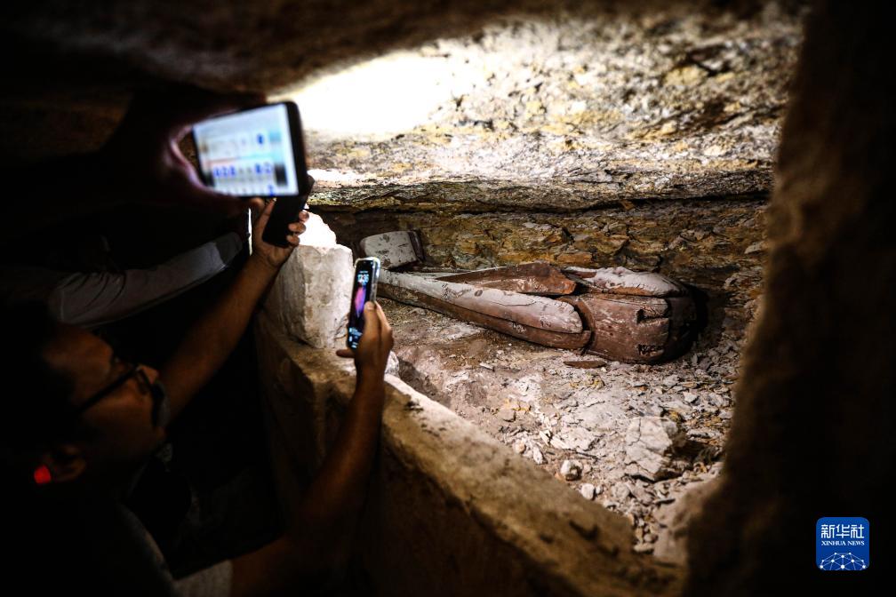 這是10月15日在埃及明亞省考古現場一座石鑿墓中拍攝的木乃伊棺槨。