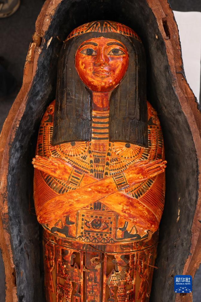這是10月15日在埃及明亞省考古現場拍攝的彩繪木乃伊棺槨。