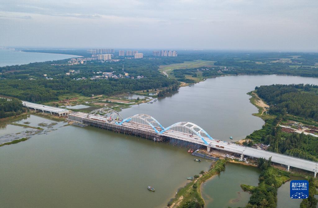 海南環島旅游公路是建設海南自貿港和創建國際旅游消費中心的先導性重大基礎設施項目,該公路主線總里程988.2公里,串聯沿途特色海灣、海角、特色小鎮和旅游景區、濱海度假區等。海南環島旅游公路臨高段全長約58公里,目前主線路基段已建設完成,工人們正在對文瀾江大橋進行橋面鋪裝、護欄、拱肋面漆噴涂等施工。