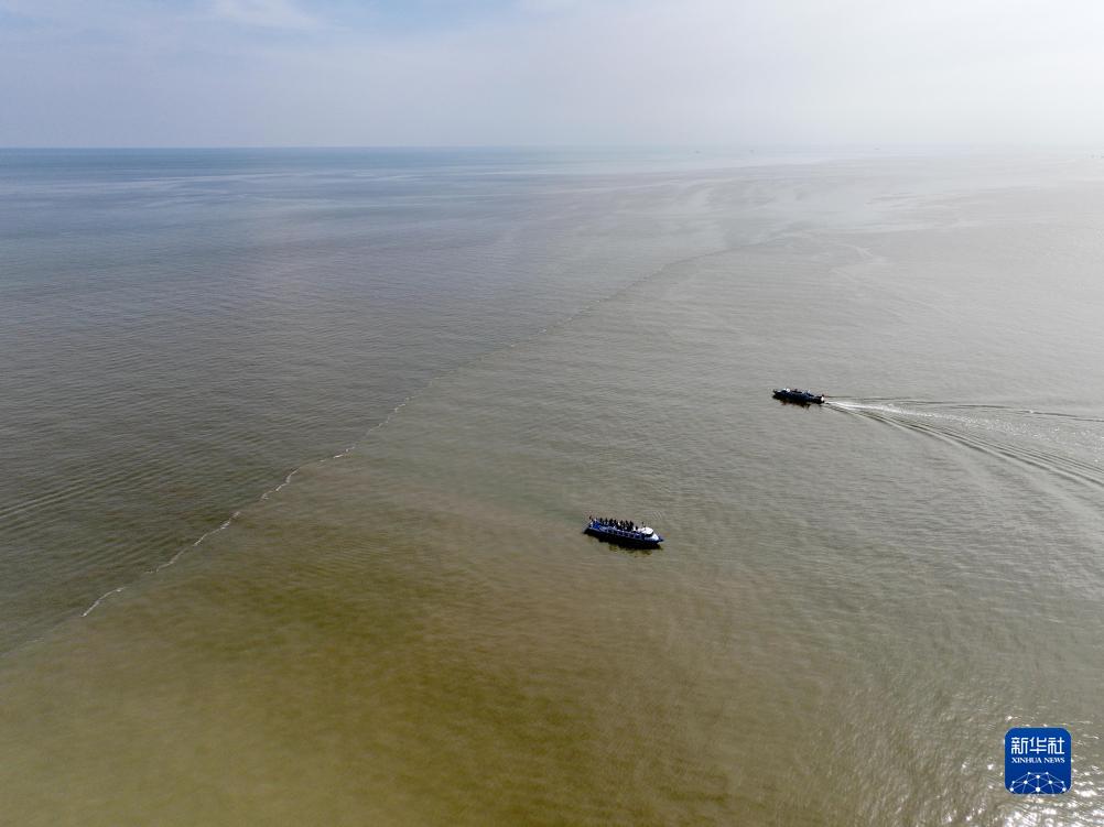 在山東省東營市黃河入海口,黃河匯入渤海。黃色的河水和藍色的海水之間形成了一條“分界線”,河黃海清,涇渭分明。