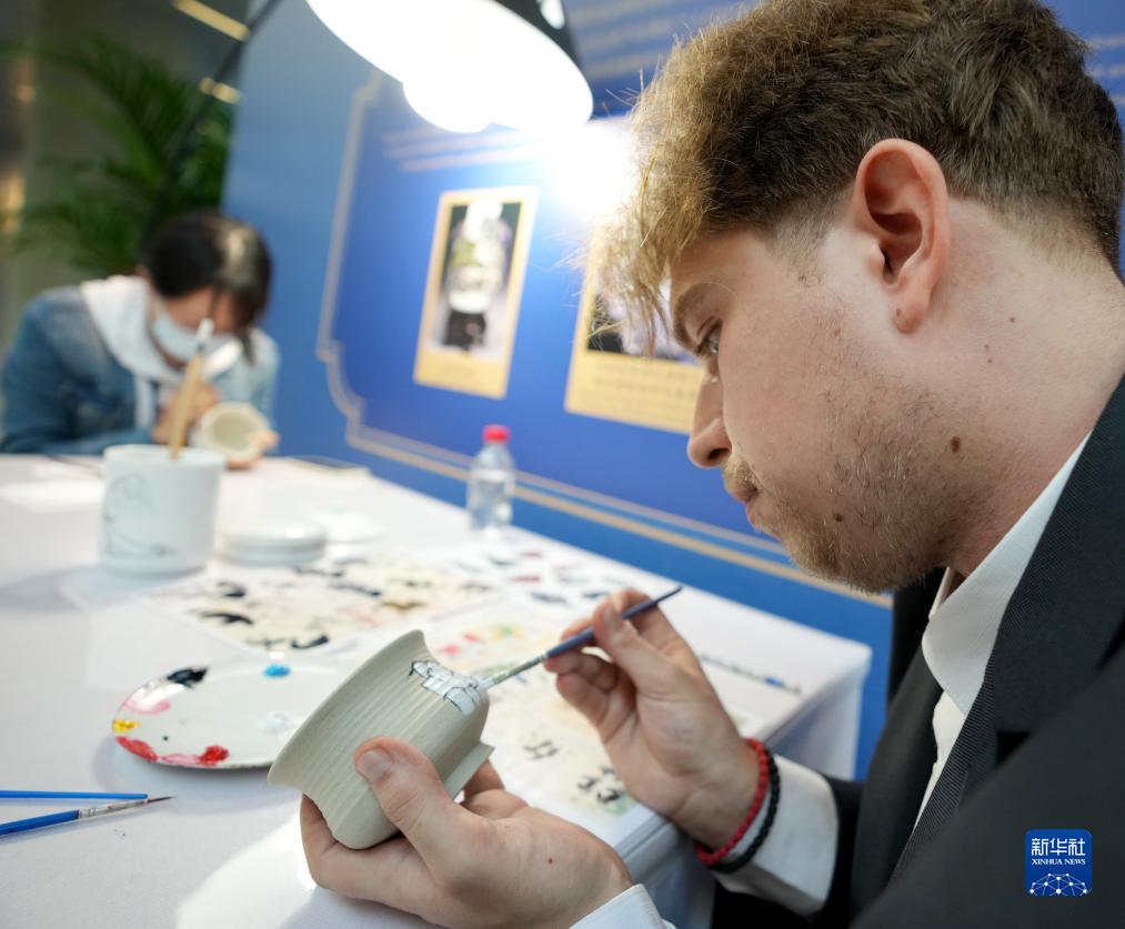 10月16日,在第三屆“一帶一路”國際合作高峰論壇新聞中心,來自匈牙利的記者體驗北京仿古瓷制作技藝。