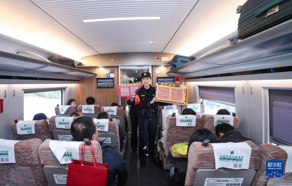 當日,沈陽鐵路公安局沈陽公安處乘警支隊女子乘務大隊民警走進高鐵車廂向乘客進行反詐騙宣傳和安全乘車宣傳,增強乘客保護人身和財產安全的意識。