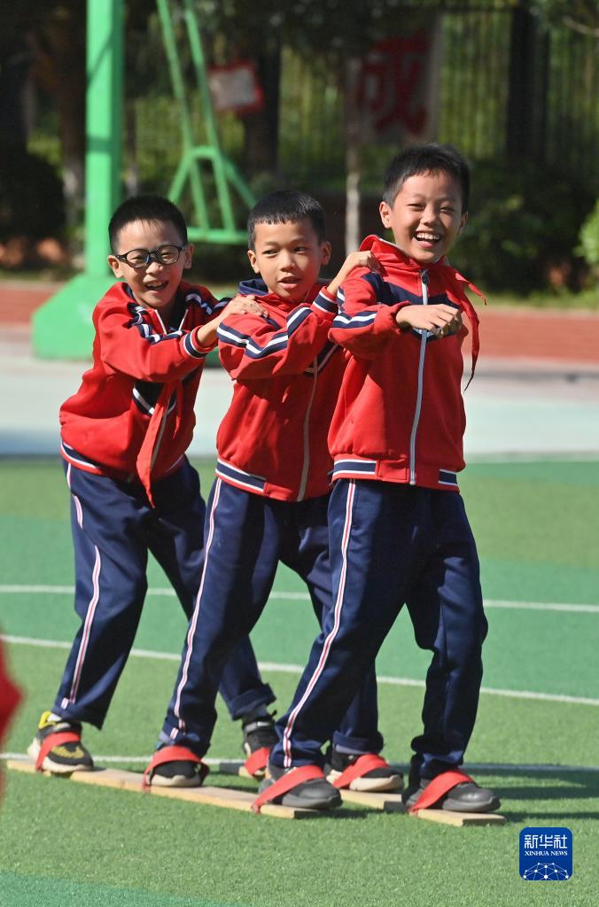 10月16日,在梧州市長洲區龍平小學,學生們在體育課上進行板鞋練習。