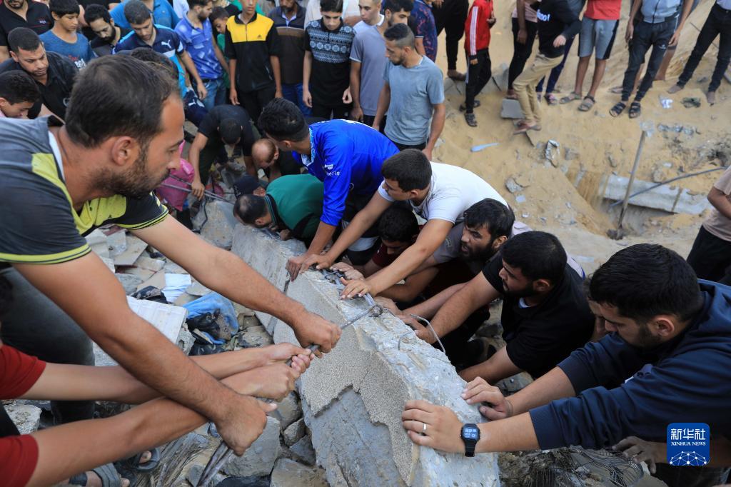 10月16日,在加沙地帶南部城市汗尤尼斯,人們在遭以色列襲擊后的建筑廢墟中救援傷者。