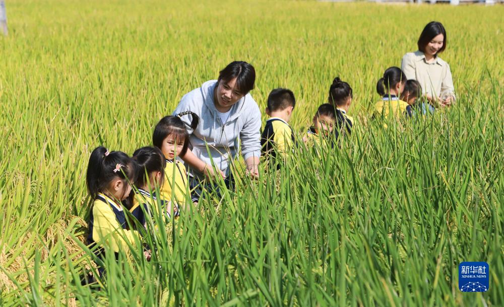 10月16日,浙江省臺州市路橋區橫街鎮紅蘋果幼兒園的小朋友在老師的帶領下走進田間,認識糧食。