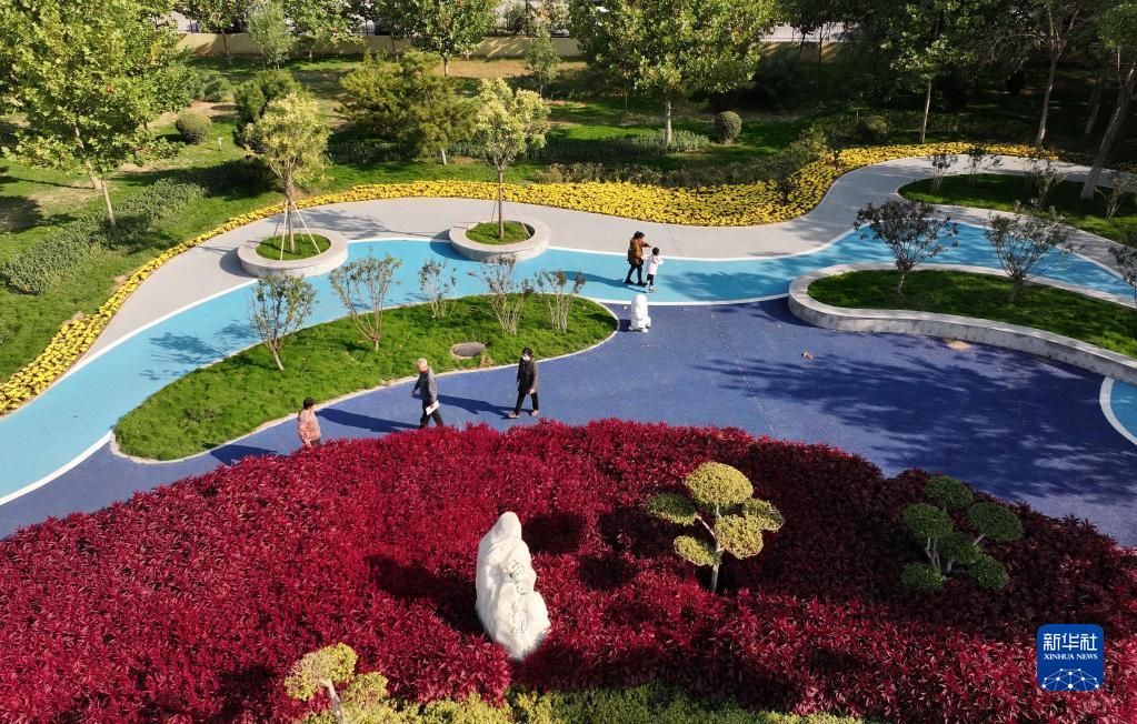 10月15日,市民在唐山市海港經濟開發區一處街角公園休閑鍛煉(無人機照片)。