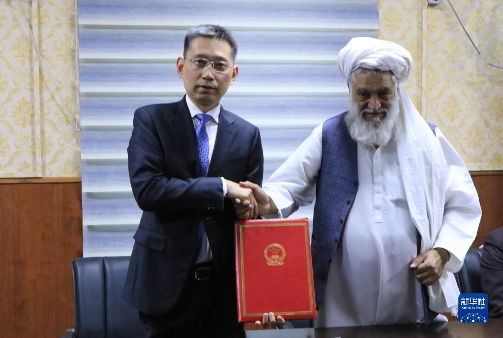 10月15日,在阿富汗首都喀布爾,中國駐阿富汗大使趙星(左)與阿臨時政府災難管理部代理部長阿洪德簽署中國政府和中國紅十字會援阿物資交接證書后握手。