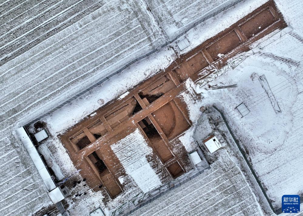 這是河南漢魏洛陽城宮城遺址的宮城東墻發掘區全景(1月14日攝,無人機照片)。