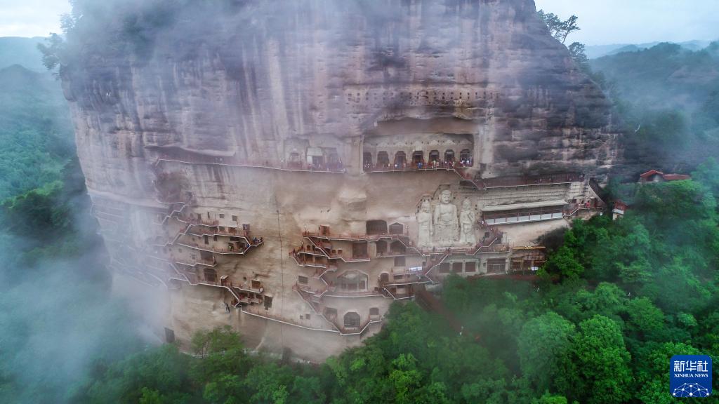 這是5月31日在甘肅省天水市拍攝的煙雨籠罩下的麥積山石窟(無人機照片)。