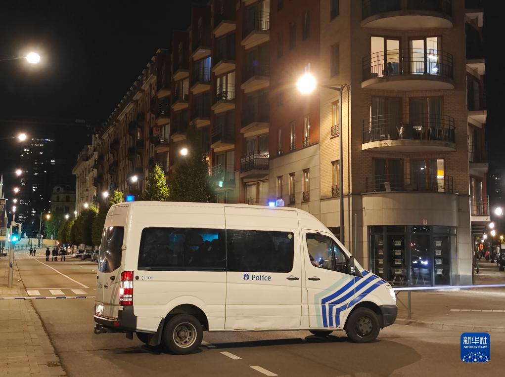 10月16日,在比利時布魯塞爾,警方在槍擊事件現場警戒。