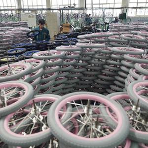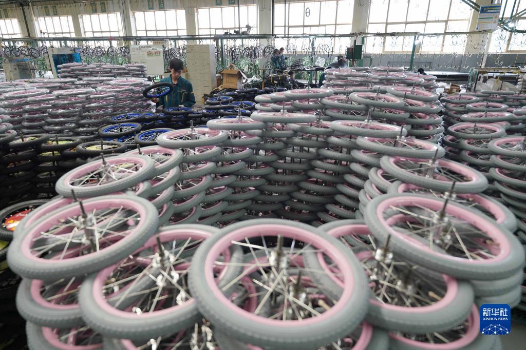 10月16日,平鄉縣一家童車生產企業的工人在整理童車輪胎。