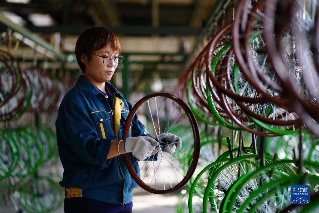 10月16日,平鄉縣一家童車生產企業的工人在檢查童車車圈質量。