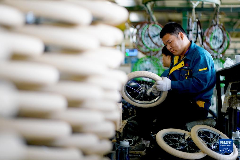 10月16日,平鄉縣一家童車生產企業的工人在組裝童車輪胎。