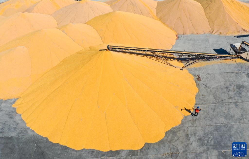 10月15日,通遼市科爾沁左翼中旗腰林毛都鎮收糧站的工人在整理烘干的玉米堆(無人機照片)。