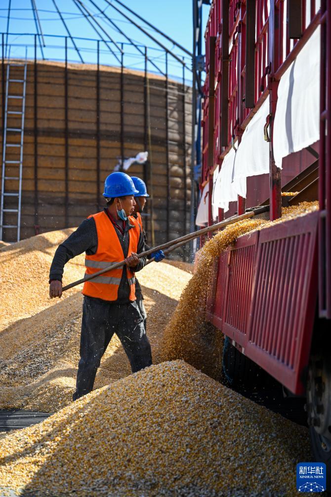 10月15日,通遼市科爾沁左翼中旗腰林毛都鎮收糧站的工人在卸糧。