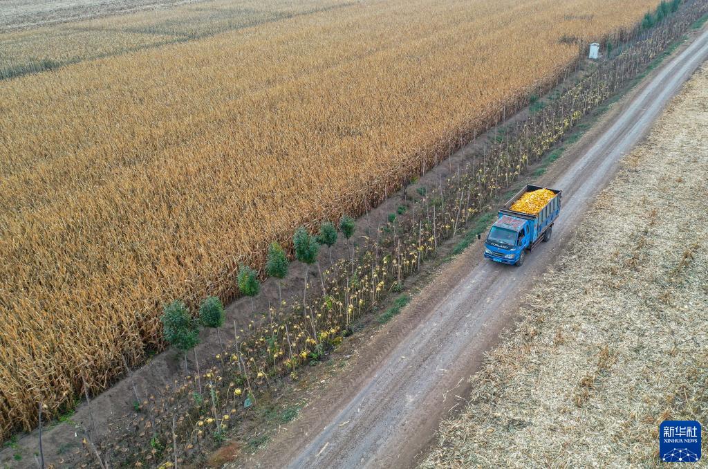 10月13日,通遼市科爾沁區錢家店鎮前西艾力村村民駕駛農用車將收獲的玉米運回家(無人機照片)。