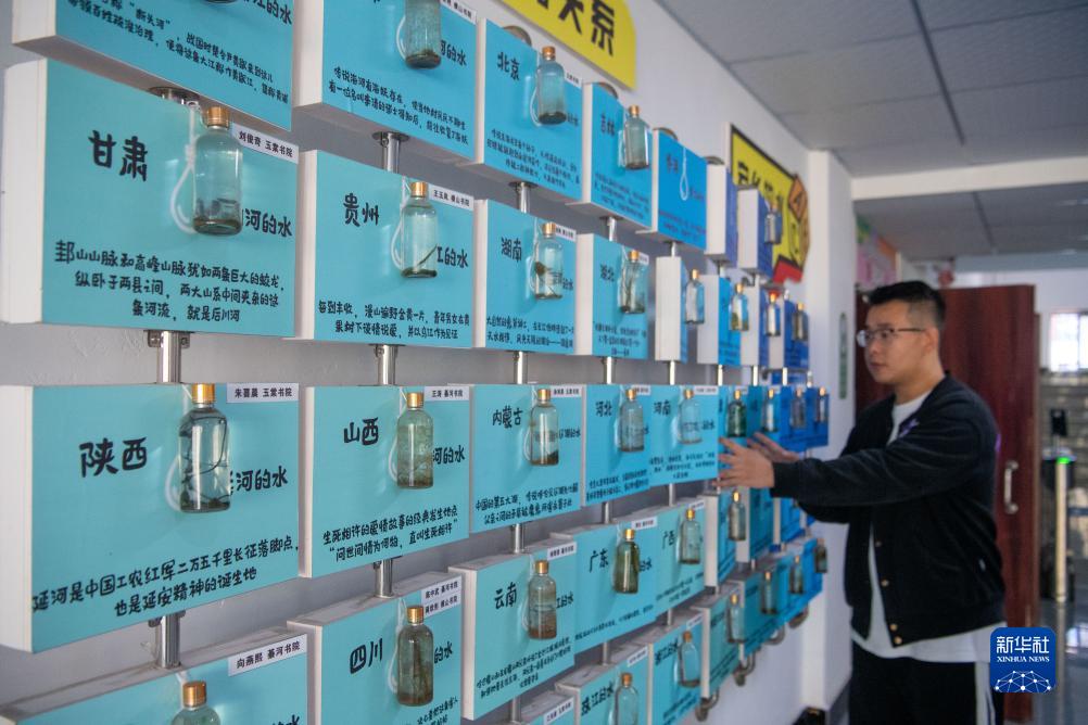 重慶移通學院“綦河書院”的鄉水情長展示廳內展示了學生從各自家鄉帶來的水(10月11日攝)。