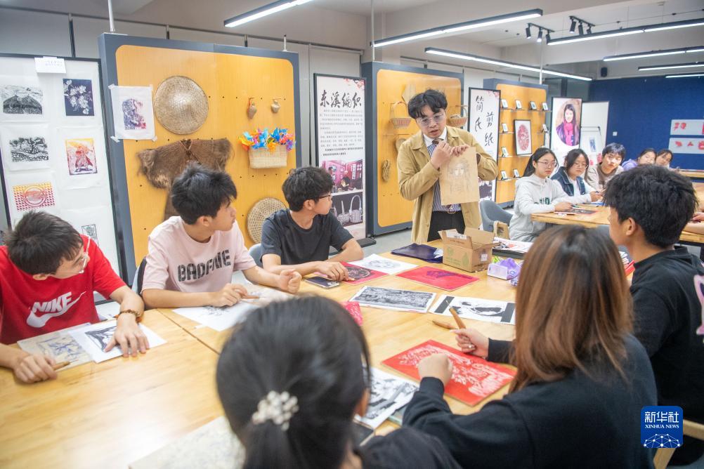 在重慶移通學院“綦河書院”的巴渝文化工作室內,老師在教授學生學習重慶市級非遺綦江農民版畫的制作。