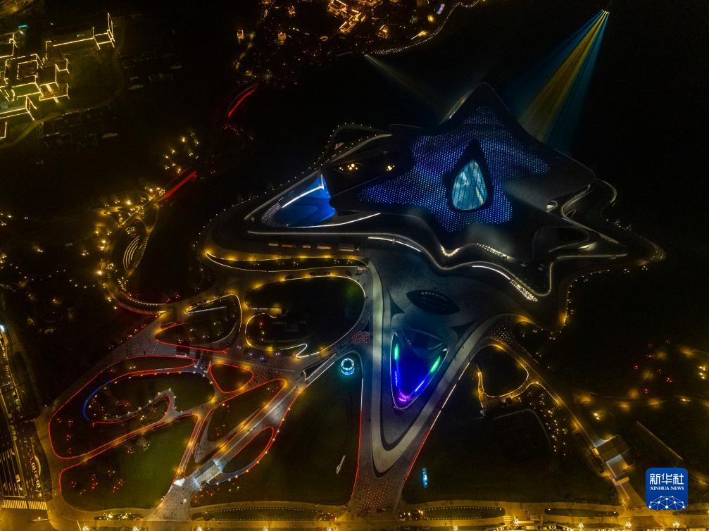 這是10月16日晚拍攝的2023成都世界科幻大會(huì)主場(chǎng)館——成都科幻館(無(wú)人機(jī)照片)。