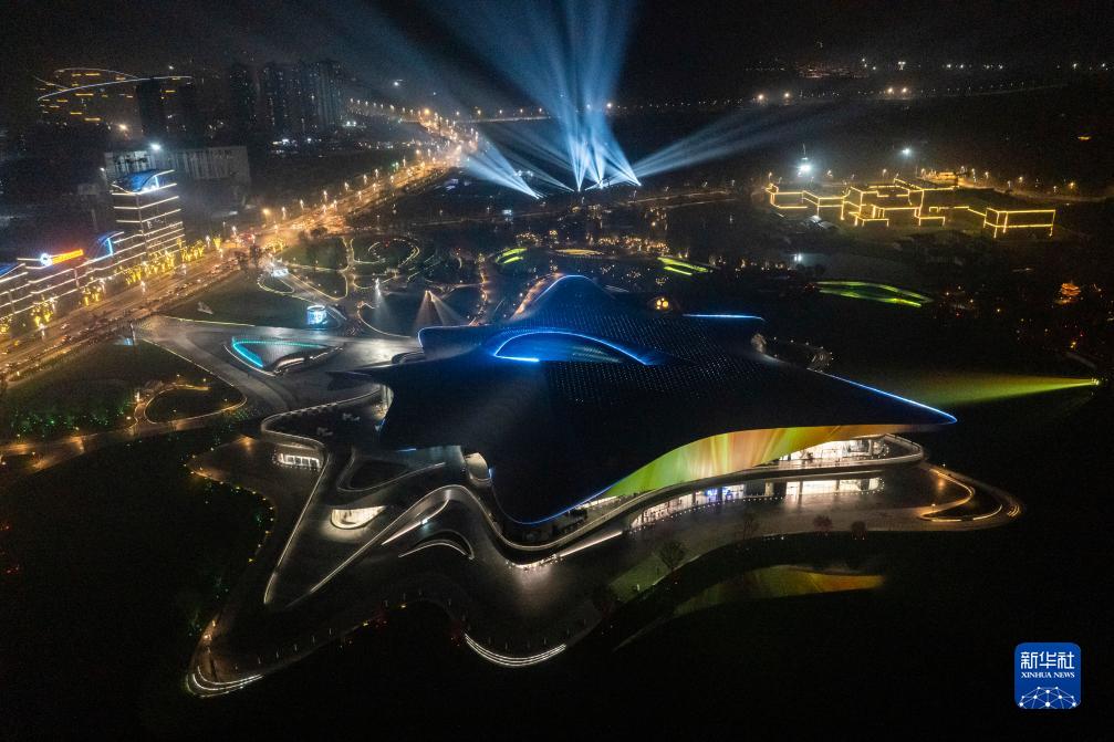 這是10月16日晚拍攝的2023成都世界科幻大會主場館——成都科幻館(無人機照片)。