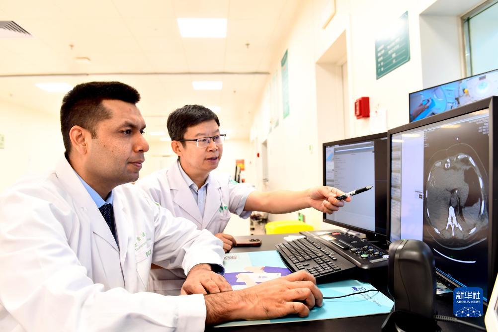 10月16日,在山東大學齊魯醫院放射科,默罕默德·沙巴茲(左)和博士后合作導師于德新在CT設備前看CT片。