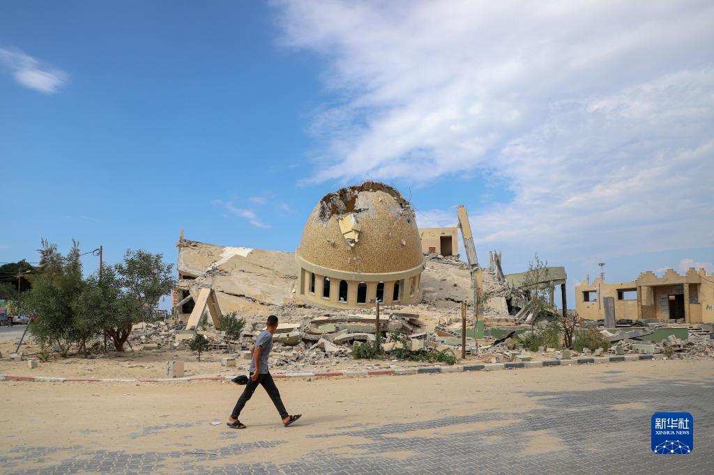 10月16日,在加沙地帶南部城市汗尤尼斯,一名男子從遭以色列空襲損毀的建筑廢墟前走過。