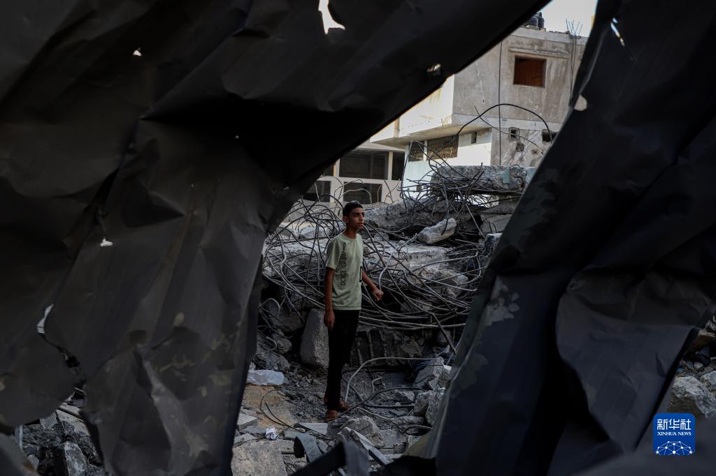 10月16日,在加沙地帶南部城市汗尤尼斯,一名男孩站在遭以色列空襲損毀的建筑廢墟中。