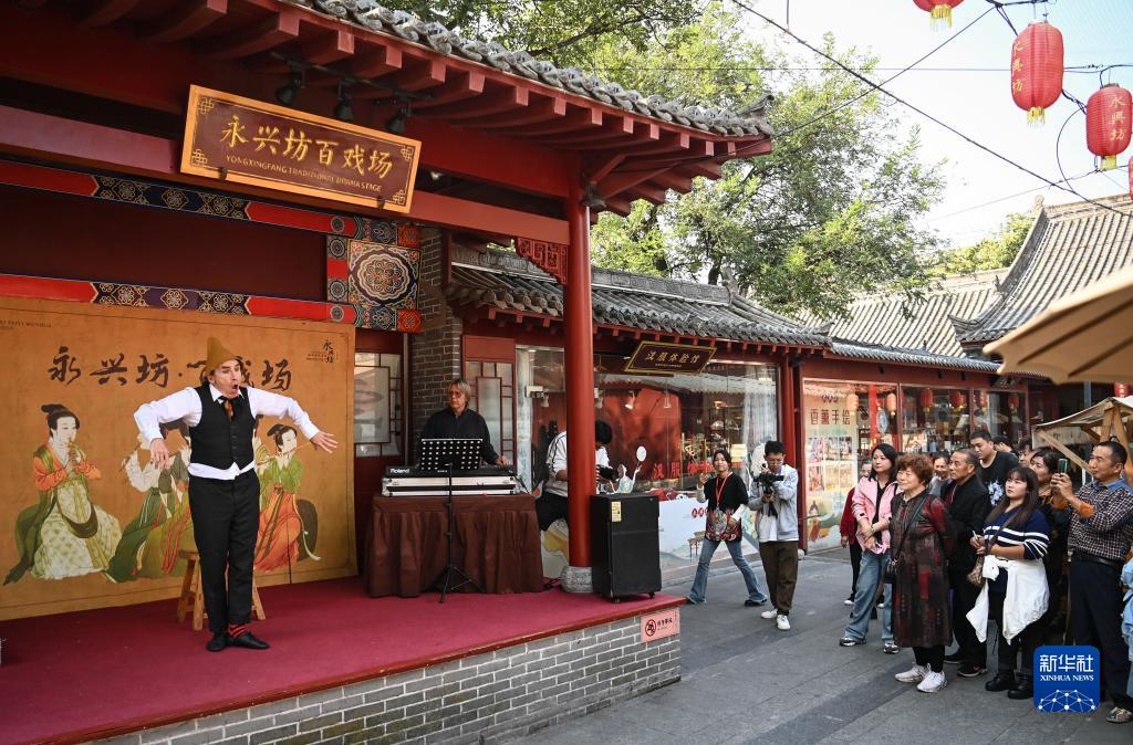 10月16日,來自斯洛伐克法帝西摩劇院的默劇表演藝術家弗拉基米爾·庫利塞克(左)在西安永興坊進行惠民巡演。