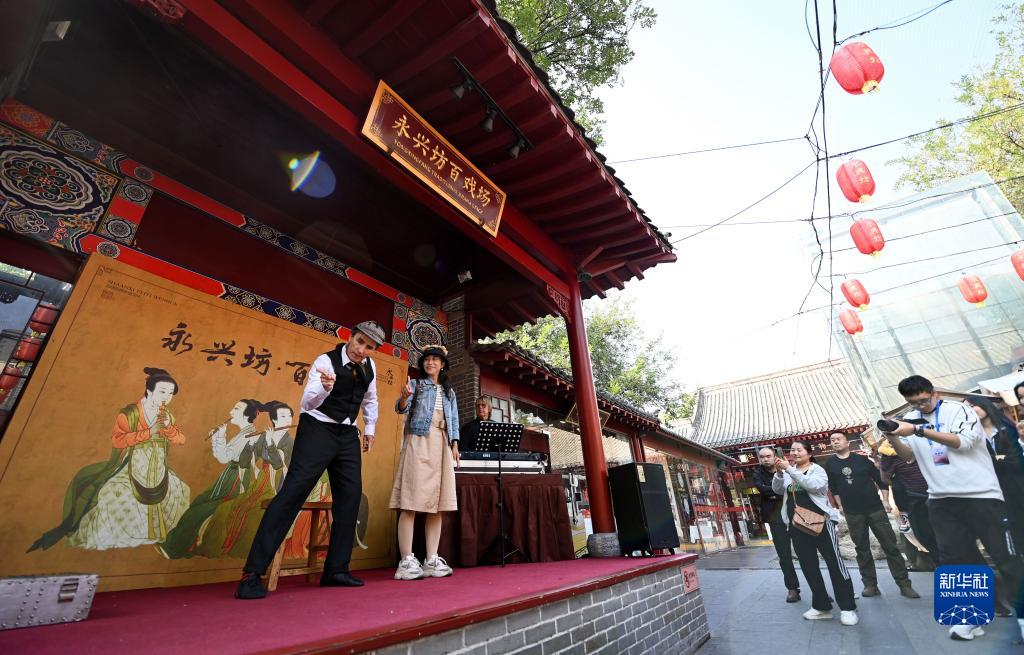 10月16日,來自斯洛伐克法帝西摩劇院的默劇表演藝術家弗拉基米爾·庫利塞克(左一)在西安永興坊進行惠民巡演時與觀眾互動。