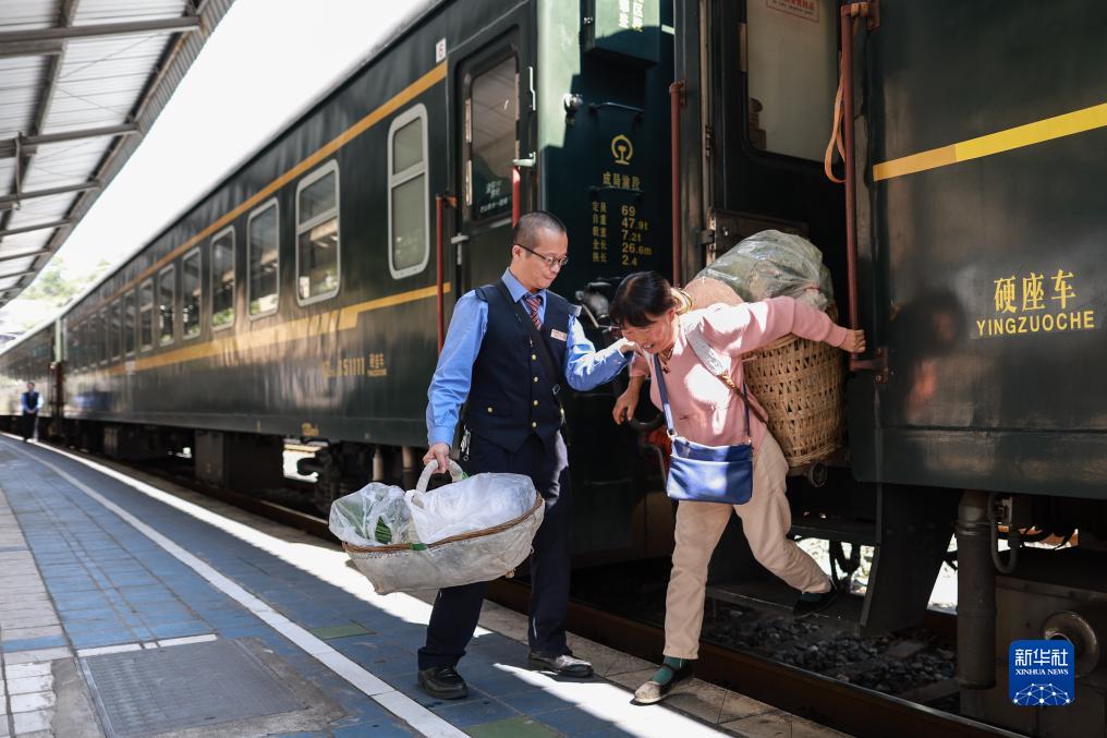 10月17日,5630次列車到達桐梓站后,村民攜帶農產品下車。