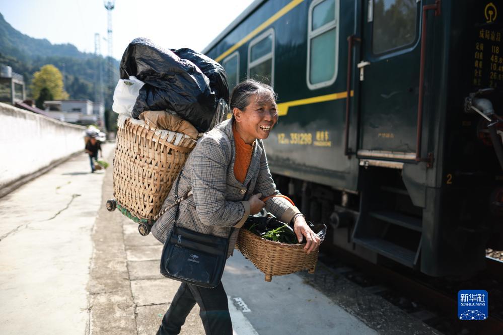 10月17日,村民攜帶農產品在婁山關站登上5630次列車。